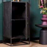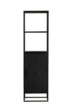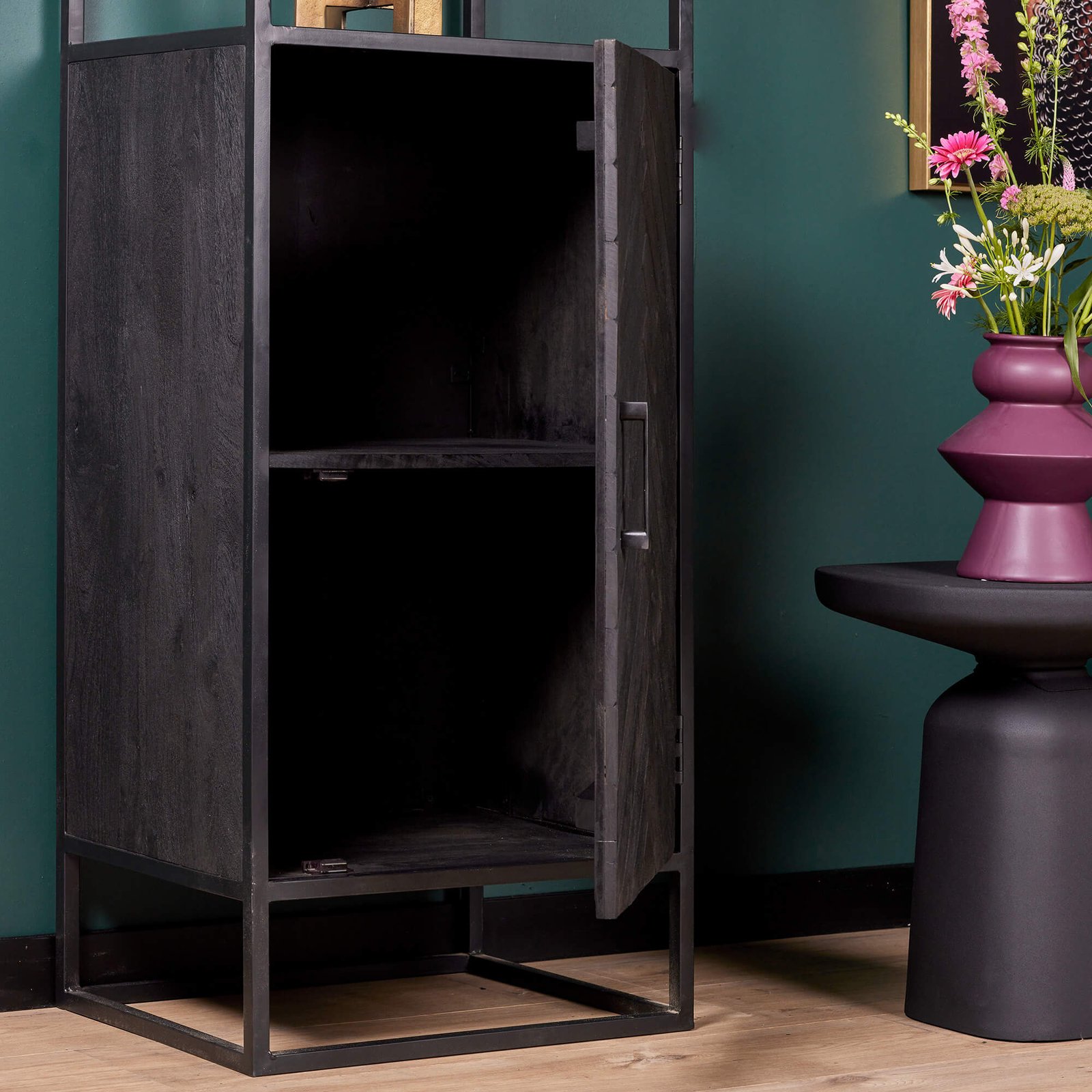 Deze boekenkast uit onze New York serie heeft 1 deur en een legplank. De kast is uitgevoerd in gezandstraald massief mangohout en is behandeld met een zwarte lak. Het mangohout in de deur is ingelegd in een visgraatpatroon. Het frame en de handgreep zijn gemaakt van metaal en afgewerkt met een zwarte lak.