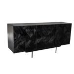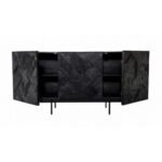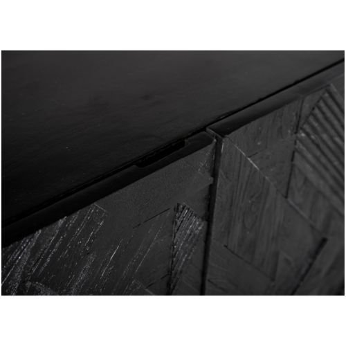 Dressoir Flair is gemaakt van massief zwart gelakt mango hout. De deuren zijn voorzien van een houtsnijwerk. De kast is voorzien van metalen poten en handgrepen.