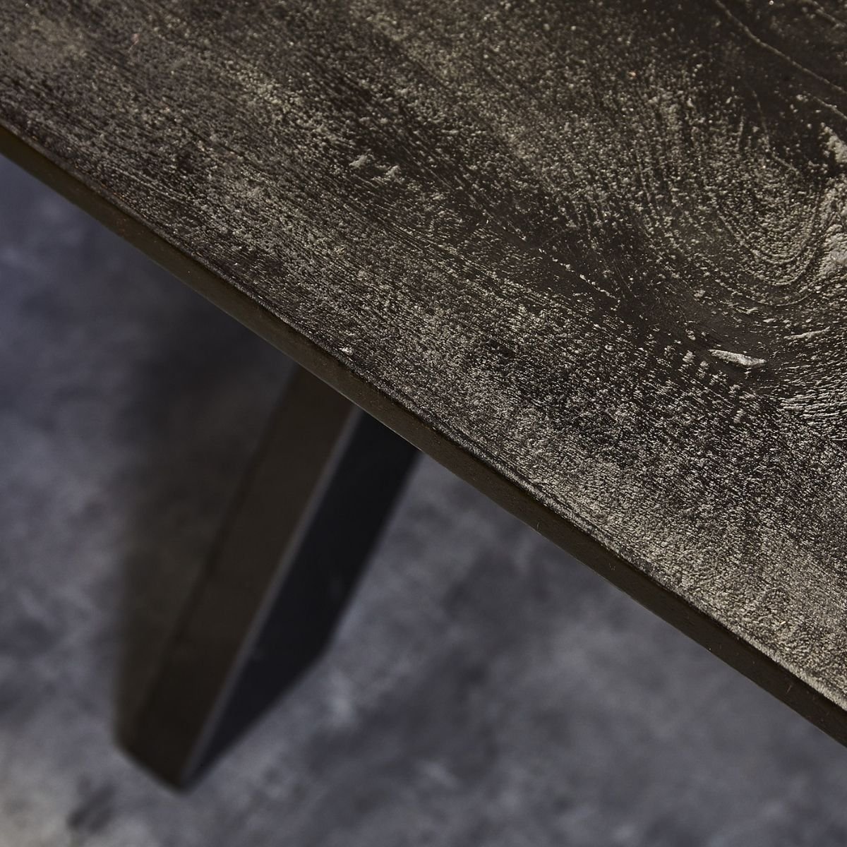 Eetkamertafel New York, rechthoek heeft een gezandstraald mangohouten tafelblad en is behandeld met een zwarte lak. Onder het tafelblad zit een zwart gelakte metalen matrixpoot.