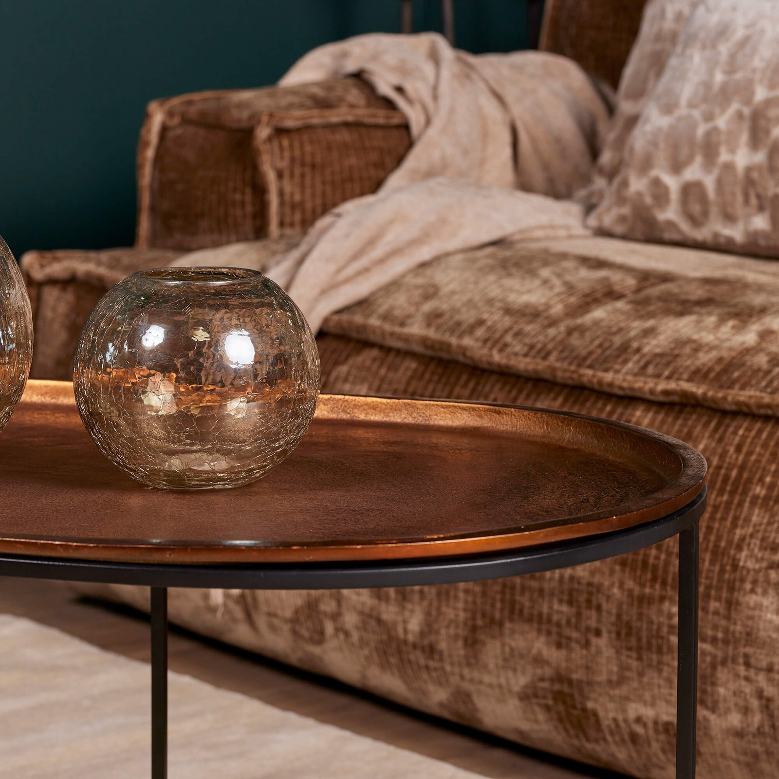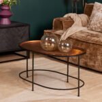 Ovale salontafel Brass is gemaakt van aluminium en ijzer. Het blad is gemaakt van aluminium en het onderstel van ijzer. Het blad is afgewerkt met een koperen gouden finish en het onderstel is afgewerkt met een zwarte finish.