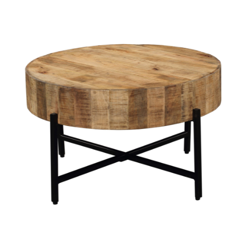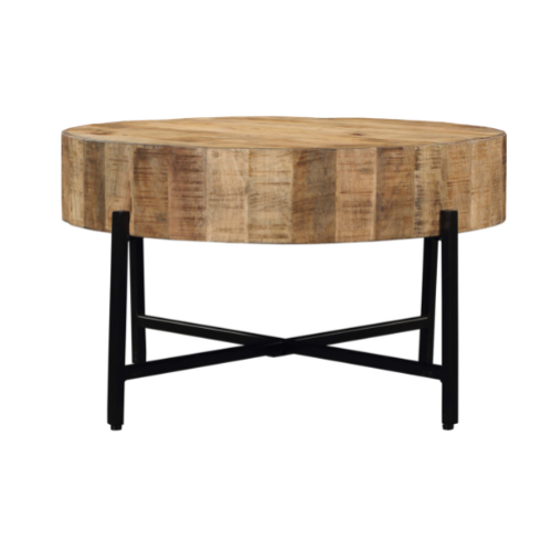 De ronde salontafel Cooper is uitgevoerd in het mangohout. Het hout is afgewerkt met een matte lak en het metalen frame met een zwarte lak.
