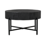 De ronde salontafel Cooper is uitgevoerd in het mangohout. Het hout is afgewerkt met een zwarte matte lak en het metalen frame met een zwarte lak.