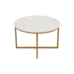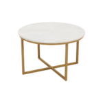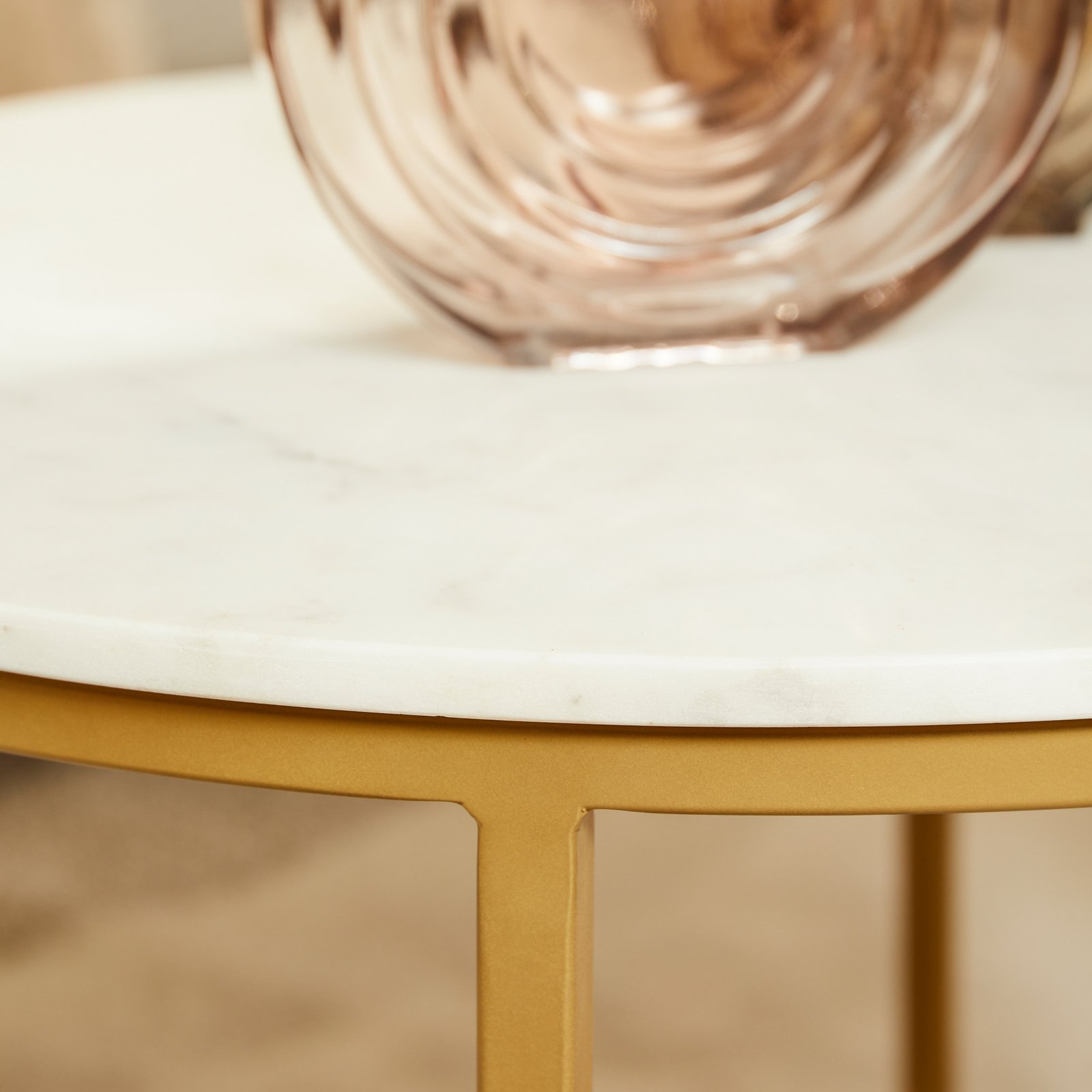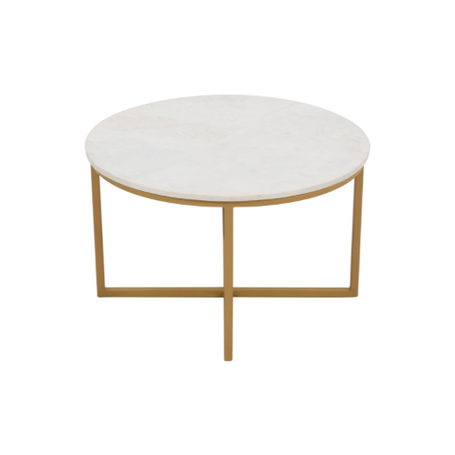 Salontafel Ryan heeft een wit marmeren blad. Ryan heeft een metalen onderstel en is bewerkt met een goudkleurige lak.