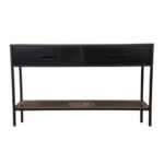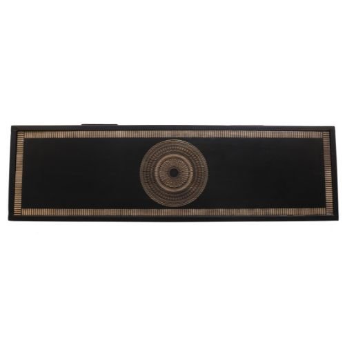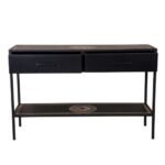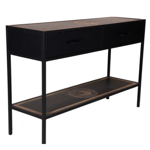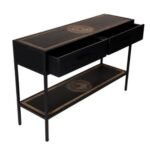Sidetable Mae is gemaakt van massief zwart gelakt hout. De bladen zijn voorzien van een houtsnijwerk. De sidetable is voorzien van metalen poten en metalen handgrepen