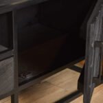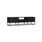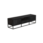 Tv meubel ‘New York’ is gemaakt van gezandstraald mangohout. Het metalen frame en de metalen handgrepen zijn afgewerkt met een zwarte lak. Dit model is voorzien van twee deuren, één lade en een open vak. Het hout is ingelegd in een visgraatpatroon en is afgewerkt met een zwarte lak.