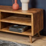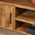 Tv meubel Omaha is volledig uitgevoerd in mangohout. Dit model is voorzien van twee open vakken en één deurtje. Het tv meubel is ingelegd met verschillende stroken gelakt hout, waar het meubel zijn eigentijdse karakter aan te danken heeft.
