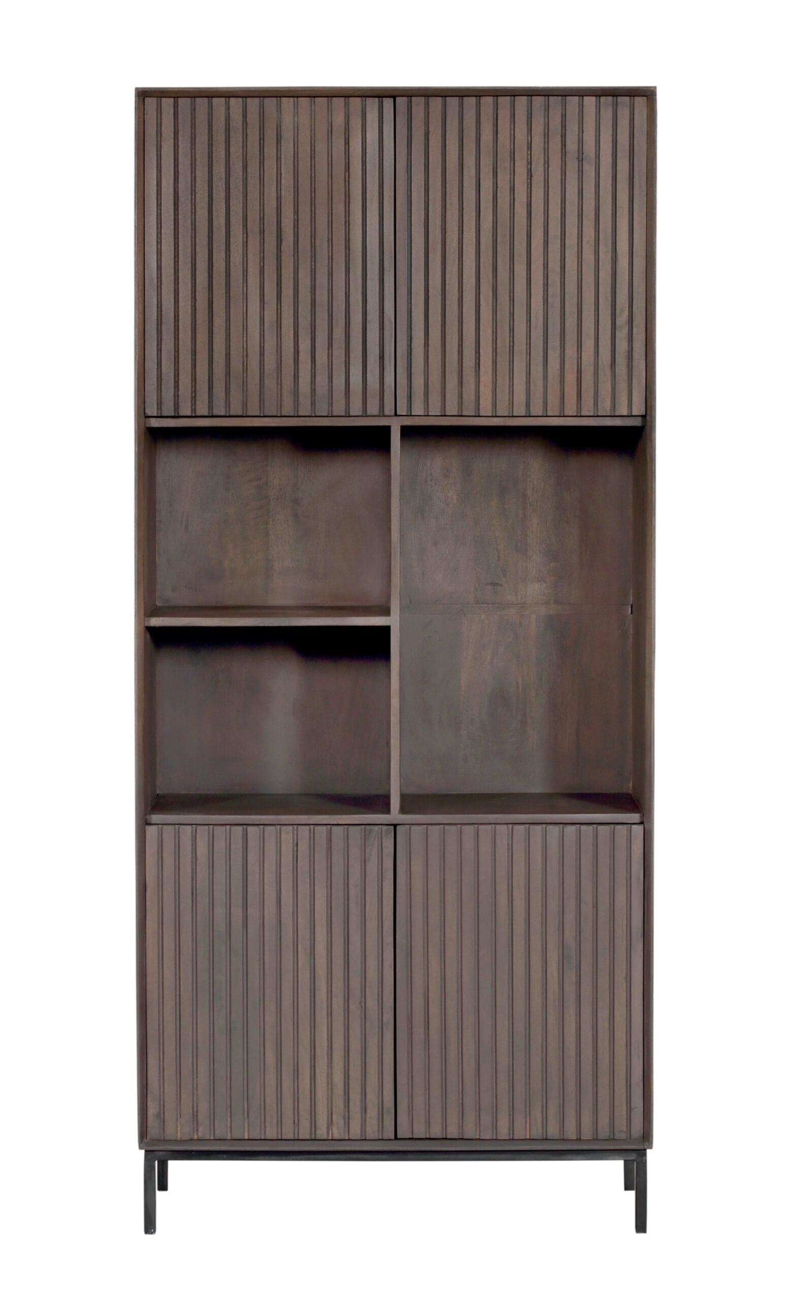 Vakkenkast ‘Madison’ is gemaakt van mangohout. Het metalen frame is afgewerkt met een zwarte lak. Dit model is voorzien van vier deur en drie openvakken. De deuren zijn voorzien van een verticaal lattenpatroon en is afgewerkt met een walnoot finish.