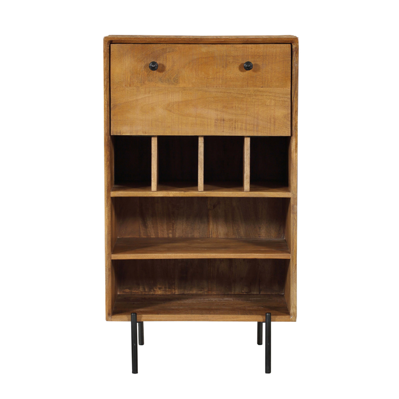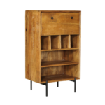 Wijnkast Portland is uitgevoerd in mangohout met een metalen poot. Dit model is voorzien van één klepdeur met daar achter een rek voor wijnglazen. De kast is ingelegd met verschillende stroken gelakt hout. Onder de klepdeur bevindt zich een vak voor vier wijnflessen en daaronder nog twee openvakken.